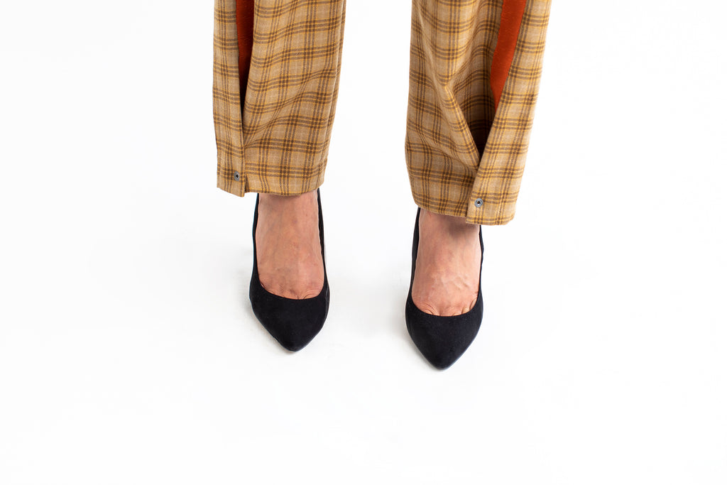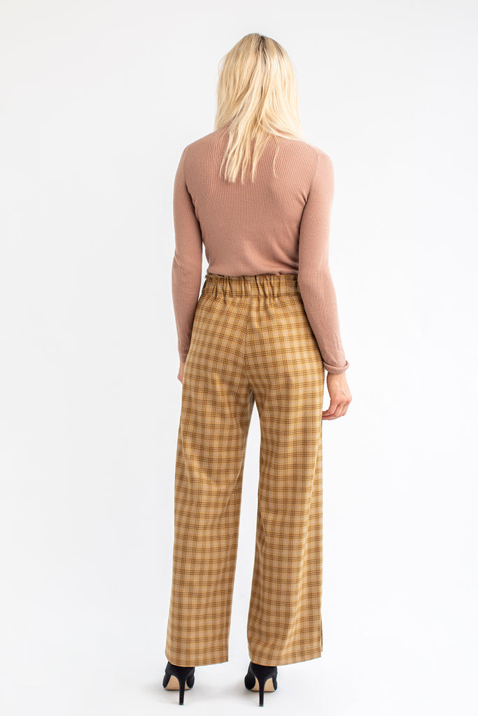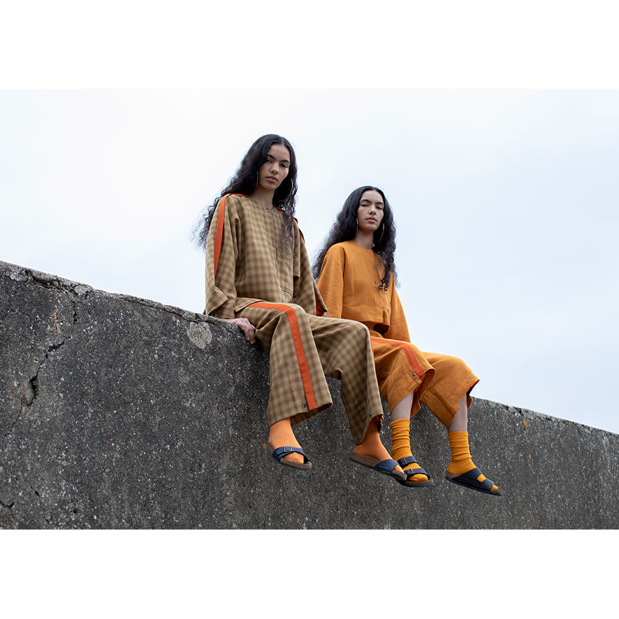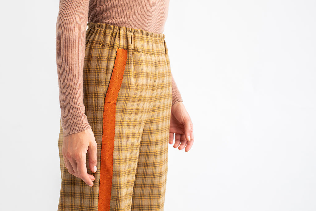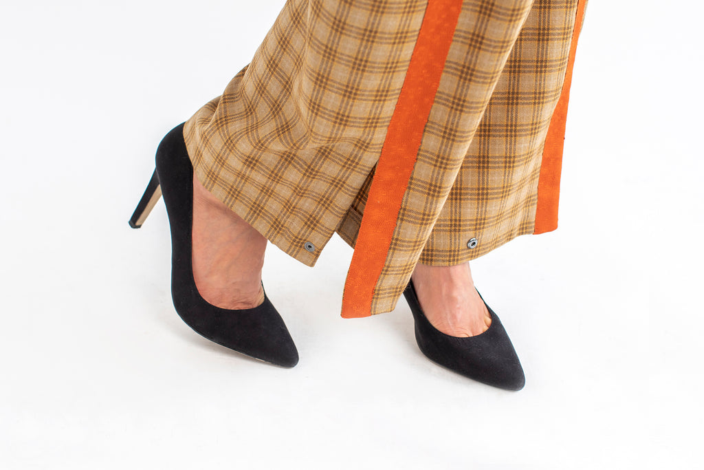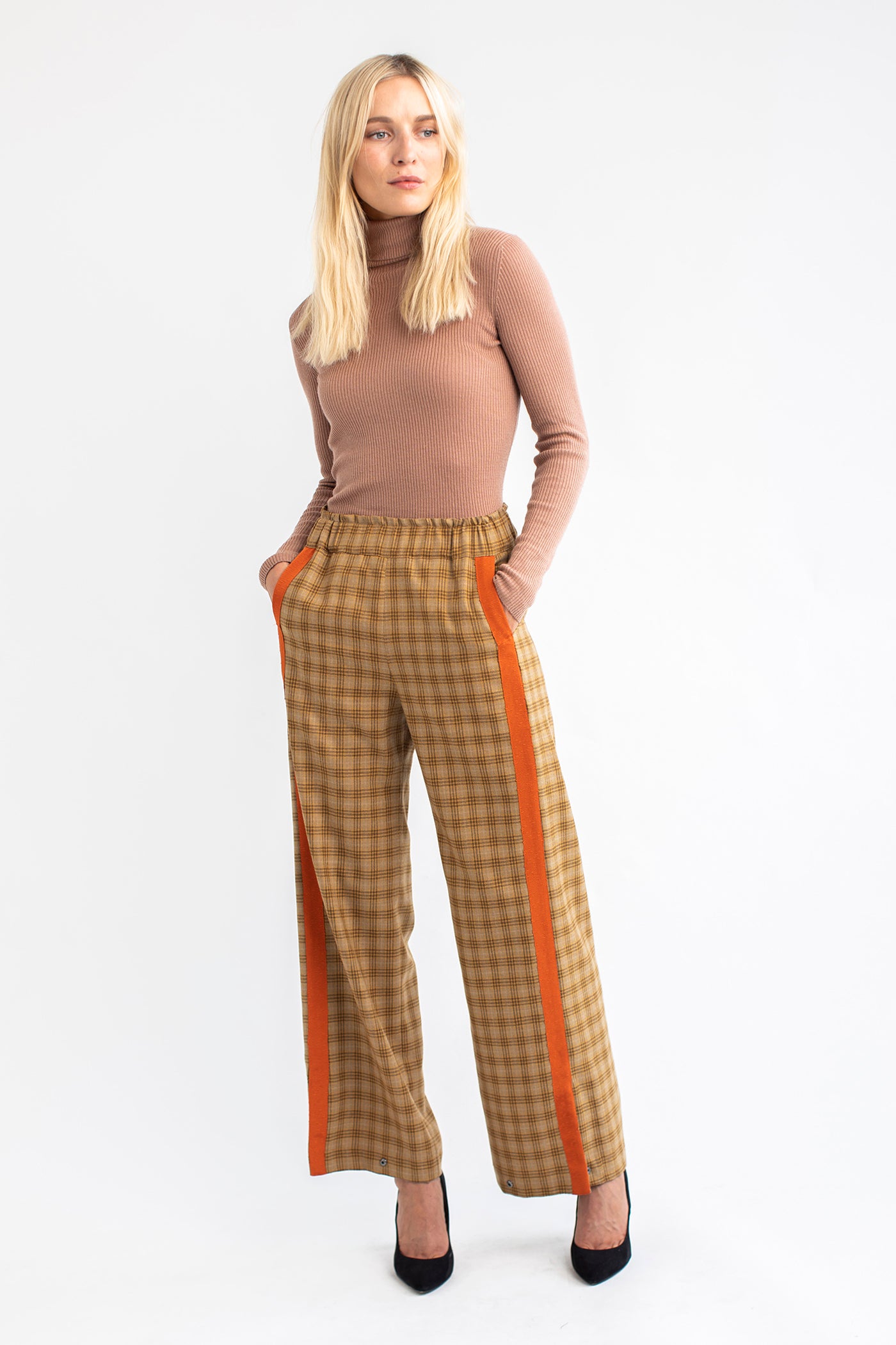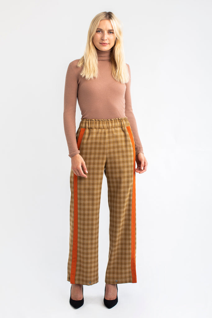 The Lux trouser features a wide leg design with slit detailing along the side seams and poppers, allowing for versatility in styling; it can be worn with a narrow hem or a slight flair. Made from 'soft touch' plaid wool sourced from Savile Row, these trousers are stylish yet comfortable. They include a burnt orange rayon stripe on both legs for a sporty touch, a ruched elasticated waistband, and side pockets for added convenience. The soft texture of the wool makes it comfortable to wear against the skin. These trousers elegantly combine luxury and comfort, making them suitable for both formal and casual occasions.