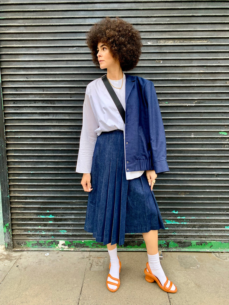High-waisted a-line skirt with bold box pleats and additional detachable punky pleats made from organic denim. A playful take on the kilt with Cleo’s signature two looks in one, using gunmetal poppers so you can play around with your pleats. Alternatively, wear it without the pleats for a more minimal streamlined look. Punk it up with Dr Martens and a men's shirt or pair it back with a simple t-shirt and sandals.